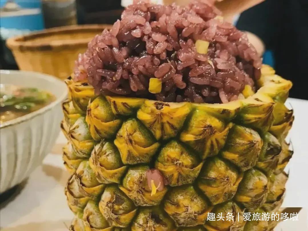 挖空的菠萝里填上紫米饭和菠萝粒,再蒸十分钟,整碗米饭酸甜相连,清香无比。