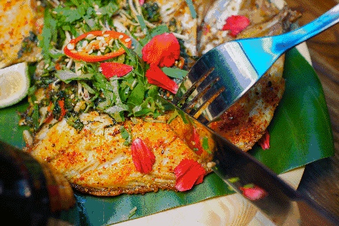 往罗非鱼鱼腹中,填进各种各样新鲜香料,在炭火上烤到鱼皮焦起,吃起来外面酥香,鱼肉松软鲜嫩。