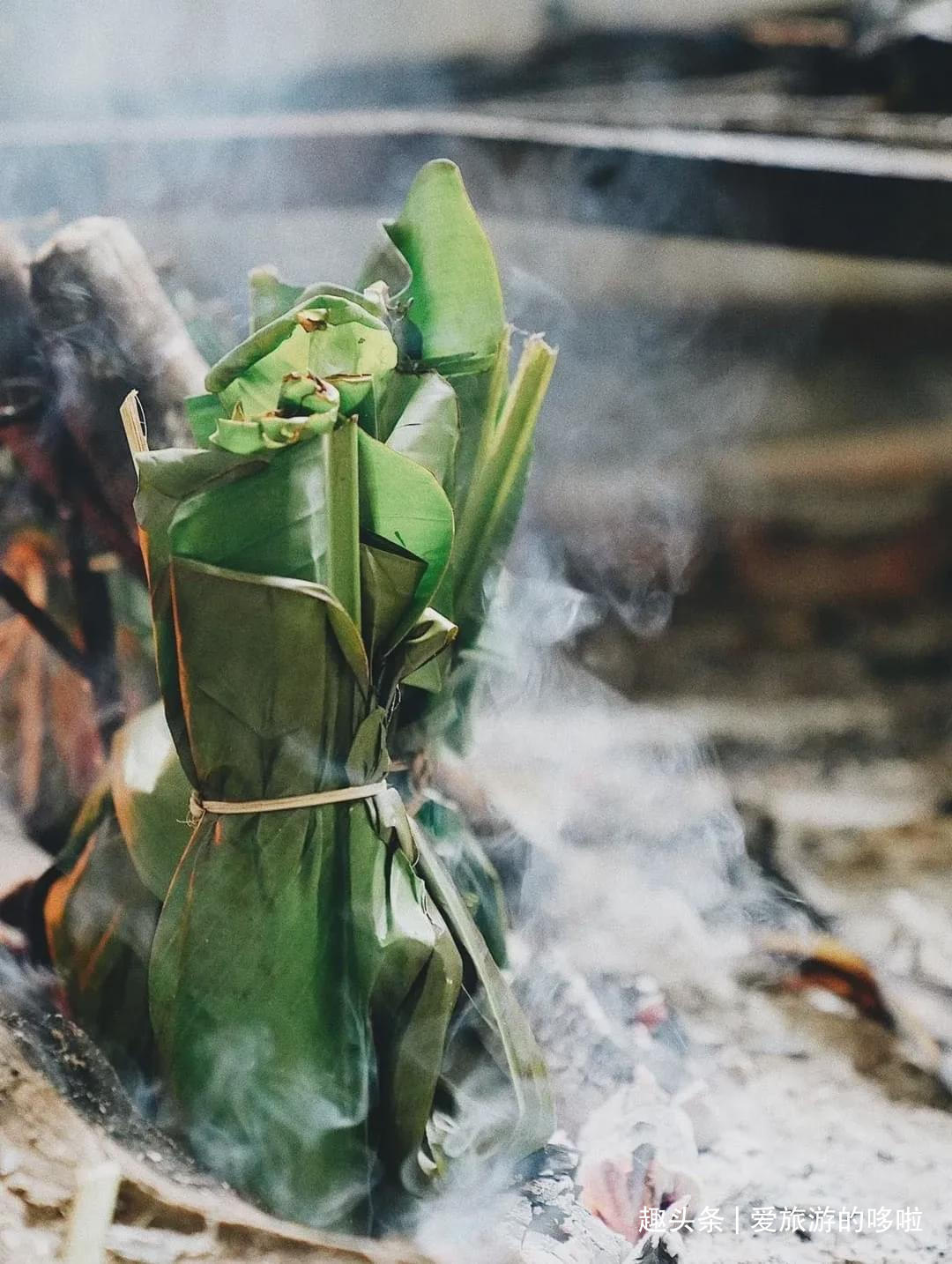 用芭蕉叶或柊叶把食材包裹,用夹棍在明火上烘烤熟透。
