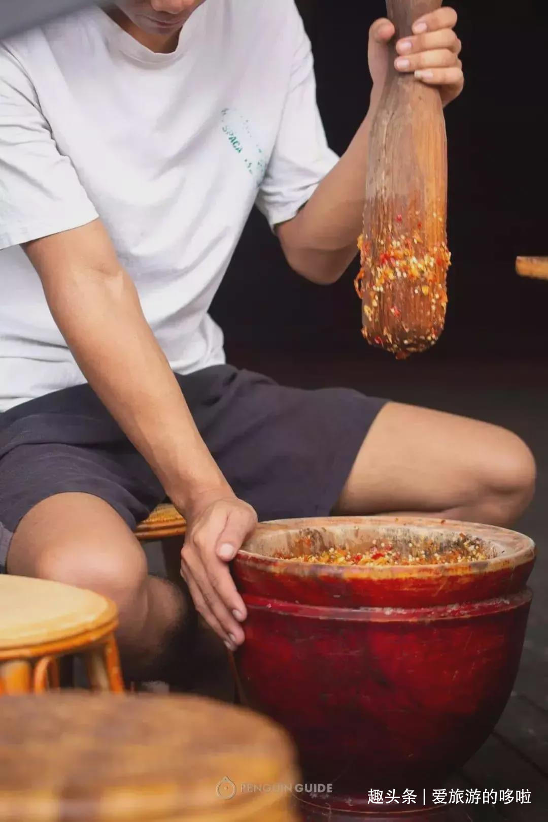 用木槌反复捶食材,让食物从松散到重新整合,辣椒、酸叶、芫荽、青蒜、香茅草…各种食材的风味互相交织在一起,