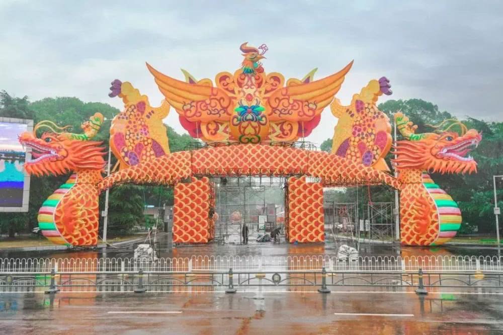 中国古典风“龙凤呈祥”大门迎接八方来客,爆竹组灯辞旧岁,福袋满满送福气,一串串火红的灯笼,亮在绿树之间。