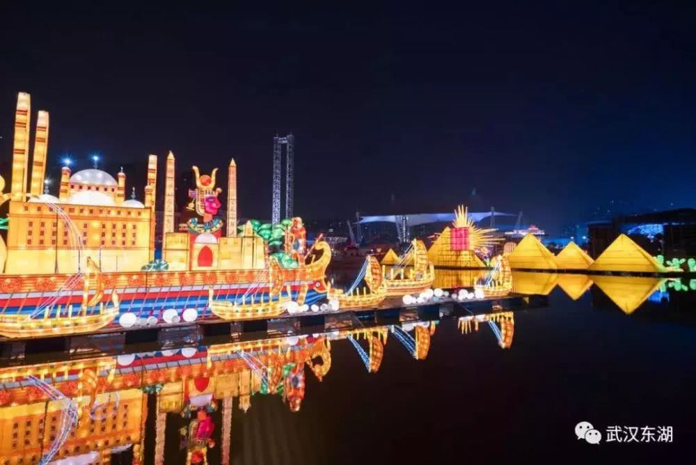 今年武汉军运会上,东湖“山水赛场”惊艳世界。为充分展现东湖自然山水优势和特色,时隔多年,东湖灯会“水上灯组”重现最大子湖郭郑湖。搭建在湖面上的灯组有光耀军运、楚韵九歌、两江四岸、绿水青山就是金山银山、年年有鱼、东湖明珠等灯组点缀在清澈的湖水上,如梦似幻。