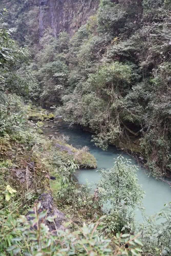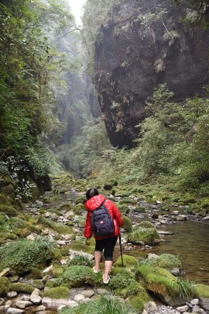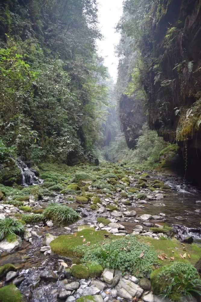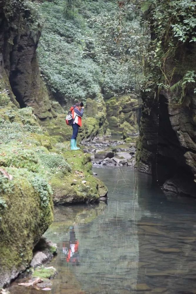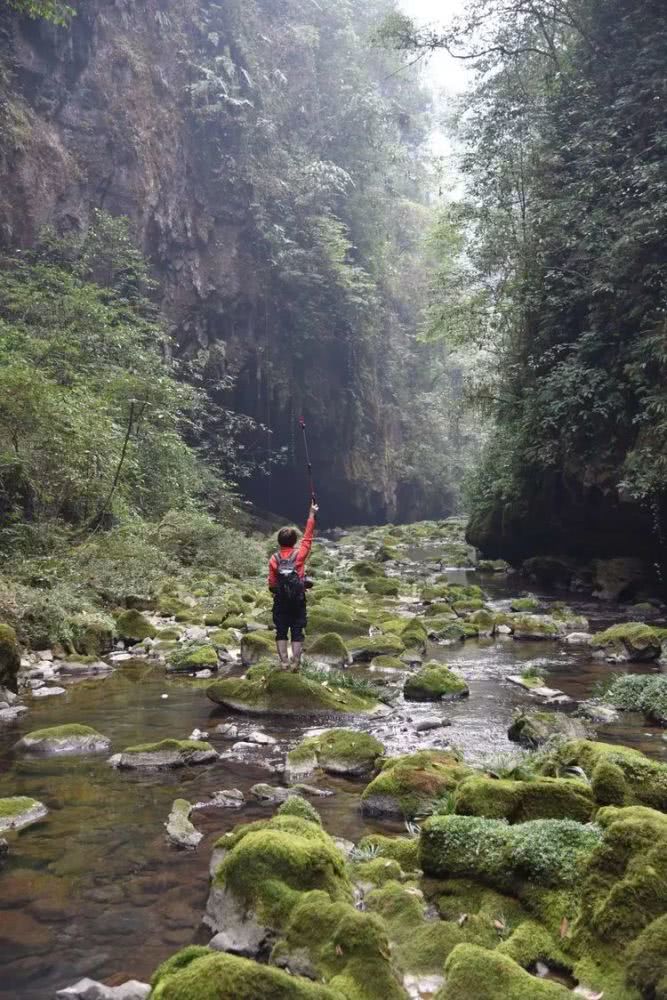 峡谷越来越窄了,对峙的峭壁相距不过四五米,河面也只剩两三米宽了。只能沿绿绒绒的石坎前行。