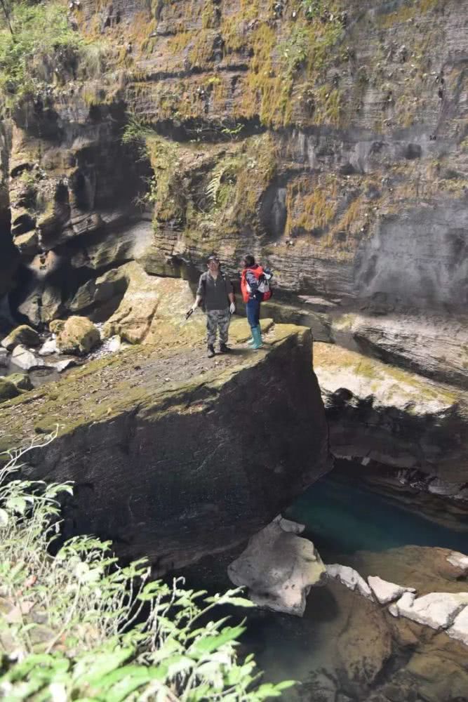 这个洞高约二十米,宽约十四五米。洞水从石上跌落形成两道低矮的白水。蓝蓝的河水深约两米,左侧峭壁上荒草萋萋,右侧需漟水,水深及腰。山重水复疑无路了。