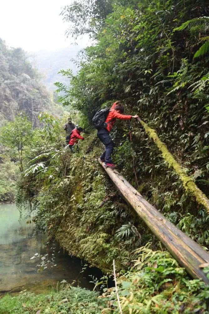 山路的尽头是两根小树干搭成的便桥,有些湿滑,好在便桥上下各有一根小树干。左手轻扶上面那根小树干,右手用力撑在便桥上,双脚轻踩下面那根小树干,慢慢地向前移动……
