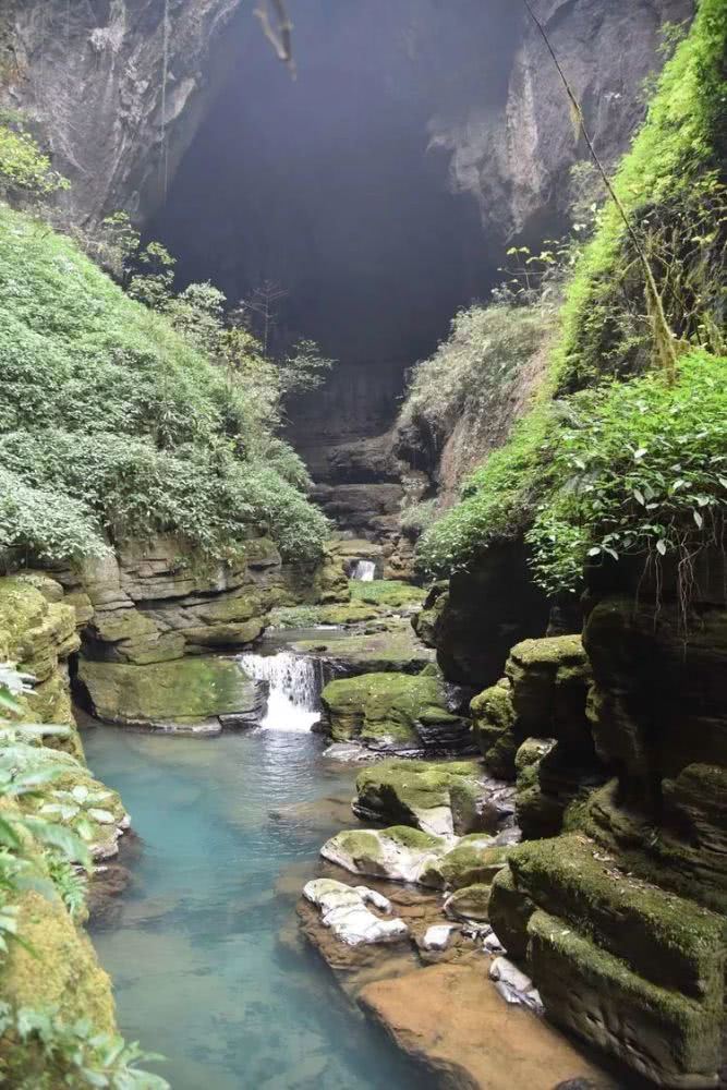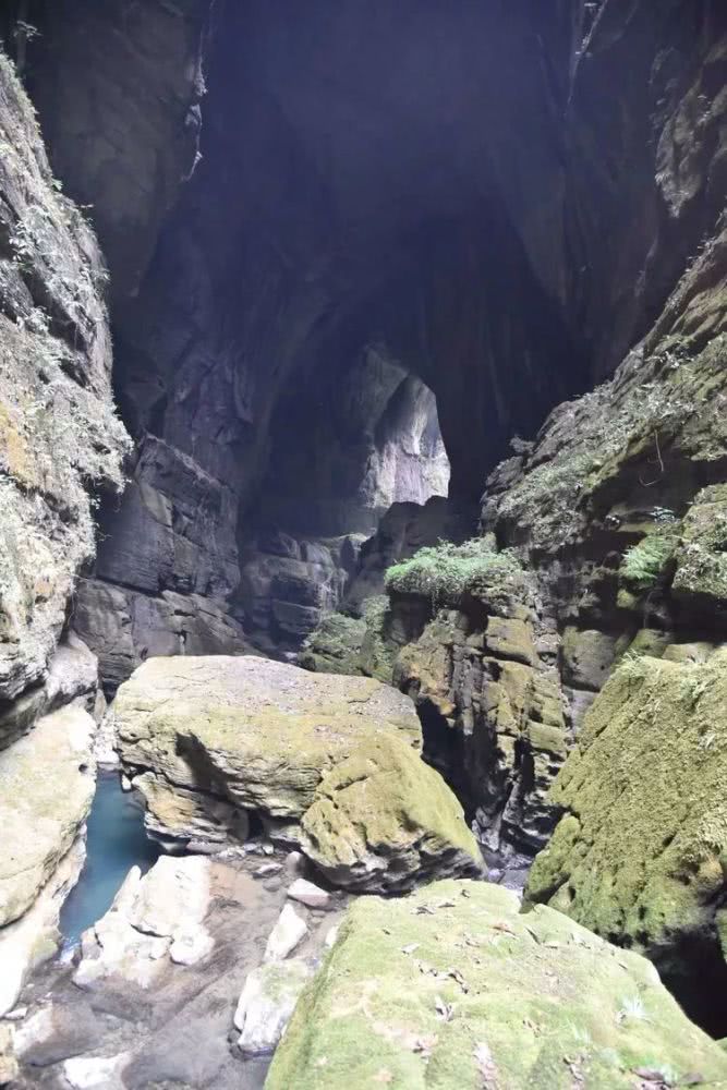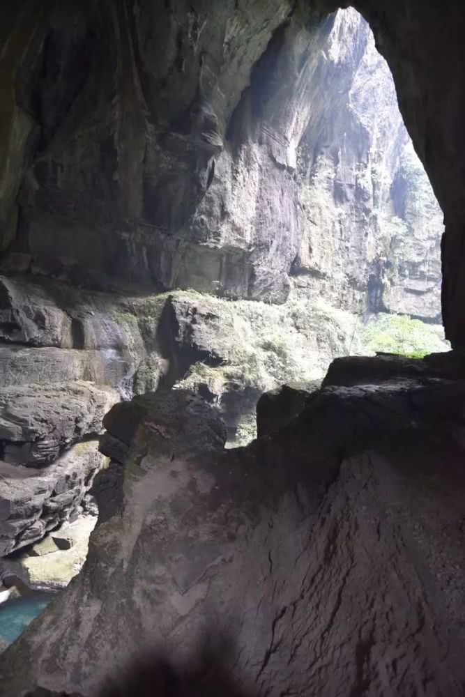 走了一二十米,前方突现一个令人震撼的出洞口,洞外又有一洞。洞内的大厅流水潺潺,蓝蓝的深潭有好几处。细长的出洞口高约三四十米,宽约十几米,洞厅内最宽处约有二十米。