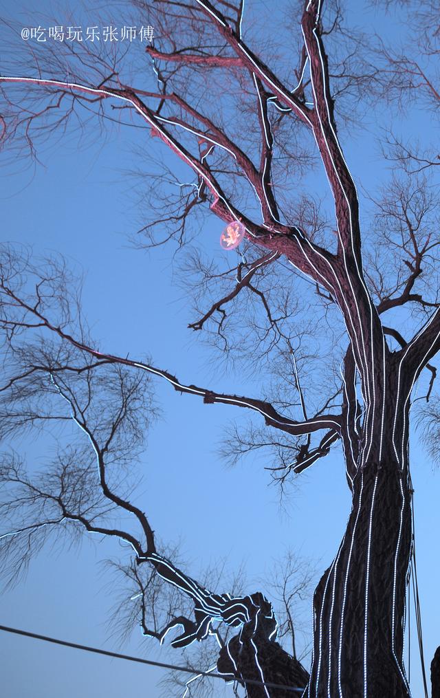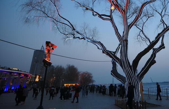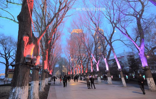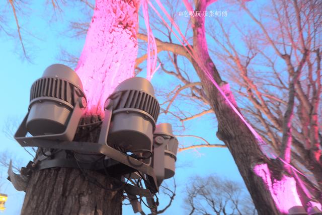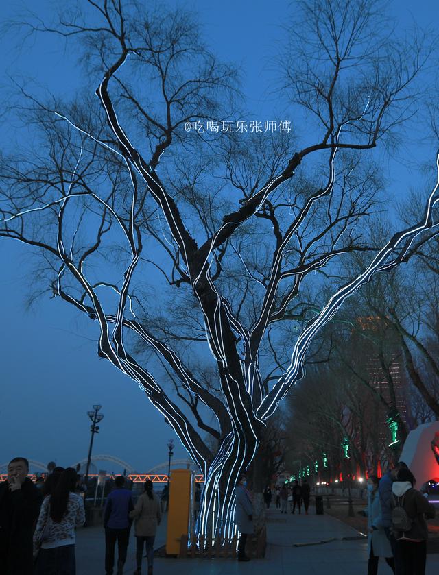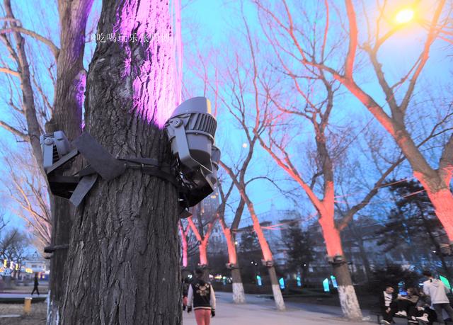 哈尔滨斯大林公园临近防洪胜利纪念塔一侧,规整高大的杨树身上,被铁箍围上,加上大射灯。傍晚,射灯不时变幻红色、绿色、蓝色等光芒,让树发出诡异的光芒,整体装饰风格,散发出强烈的“屯风”。