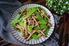 荷兰豆炒蟹味菇 材料:蟹味菇、荷兰豆、香油、盐 做法: 1.蟹味菇择掉根部,洗净。放沸水中焯至变软。捞出沥干水分。荷兰豆择掉两头的筋,洗净。 2..锅中放适量的油,油热放入葱