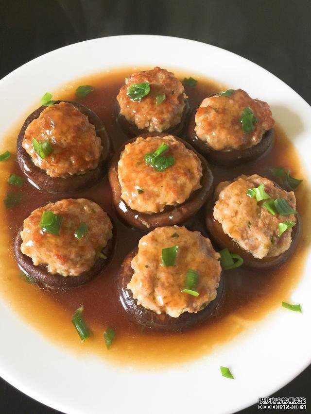 将盘中的汤汁倒入平底锅中。可以在肉上撒一点葱花装饰一下。平底锅里再加入一汤勺蚝油,大火烧开后,倒入事先勾好芡汁,搅拌粘稠关火,浇在香菇酿肉上。