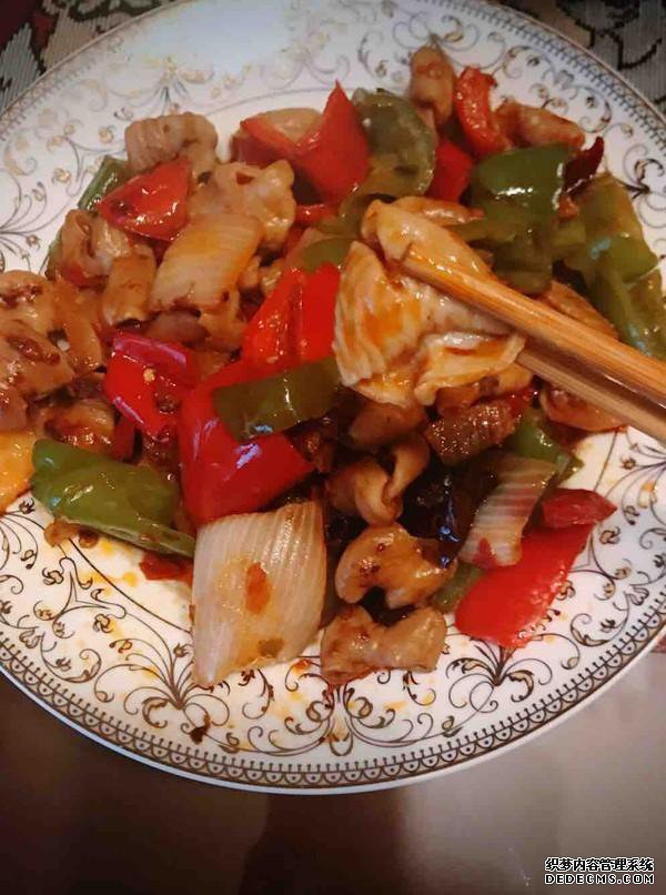 猪大肠500克、柿子椒1.5个、红椒1个、洋葱少许、姜六片、白糖1大勺、豆瓣酱1勺、干辣椒3个、蒜1个、料酒5毫升