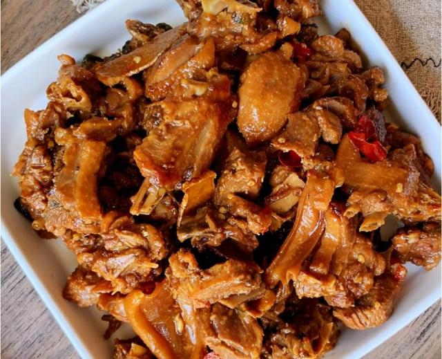 3、全部翻炒均匀之后倒入1瓶啤酒稍稍没过鸭肉,大火烧开之后转小火焖煮半个小时,煮至汤汁明显变少之后大火收汁,收汁的时候要不停的翻炒,鸭肉完全炒匀入味之后即可出锅。