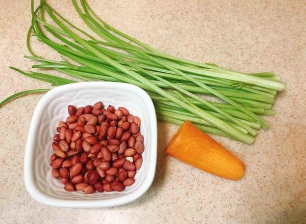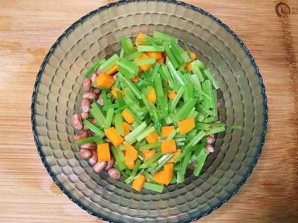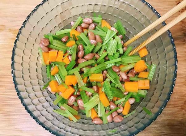 芹菜 150克、花生米 100克、胡萝卜 1小段约60克、花椒 15粒左右、香油 10毫升、精盐 1小勺、糖 1小勺、生抽 10毫升、八角 1个、香醋 5毫升