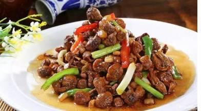 6、净锅上火入油炙锅,留少量余油放入辣椒条、葱段、肉丁,迅速转入烤松茸调味起锅装盘。