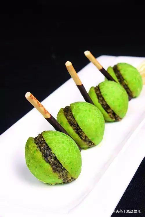 4、取“椭圆”4个,用刀从中轻轻剖开,不要切断,然后夹入一层咸菜碎,合起后摆入长盘,点缀巧克力饼干棒3根和柠檬片走菜即可。