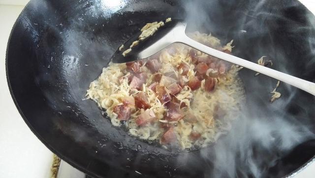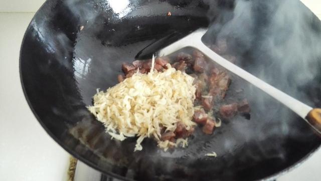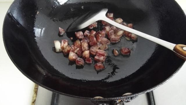 4.热油锅,放入腊肠煸炒