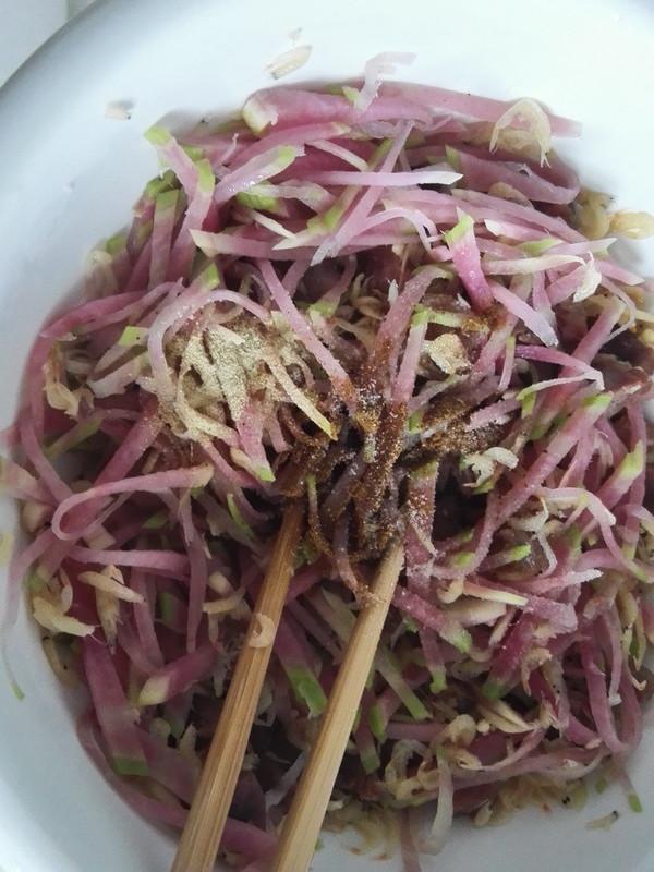 8.腊肠,虾米,萝卜丝混合,加入五香粉,胡椒粉,少许的盐拌匀