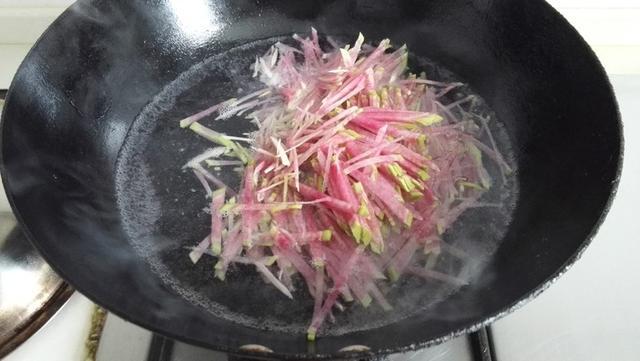 7.锅里烧开水,放入萝卜丝焯水,水开后,立马捞出