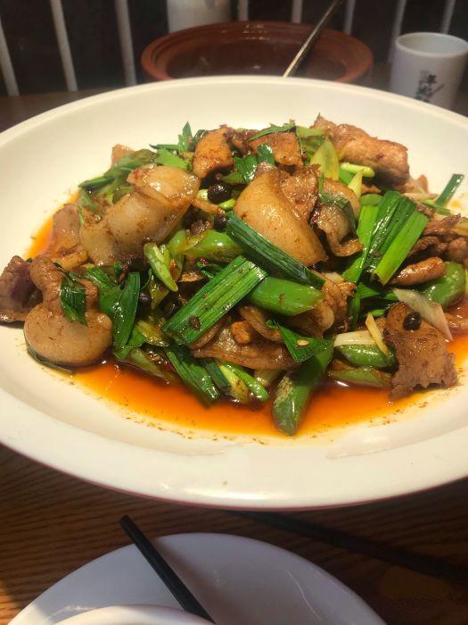 取成华猪的臀部,先放到清水中煮到八成熟,捞出来沥干水分切成薄片再下油锅爆炒,葱蒜为其去除腥气,豆豉和郫县豆瓣使其重新拥有灵魂。