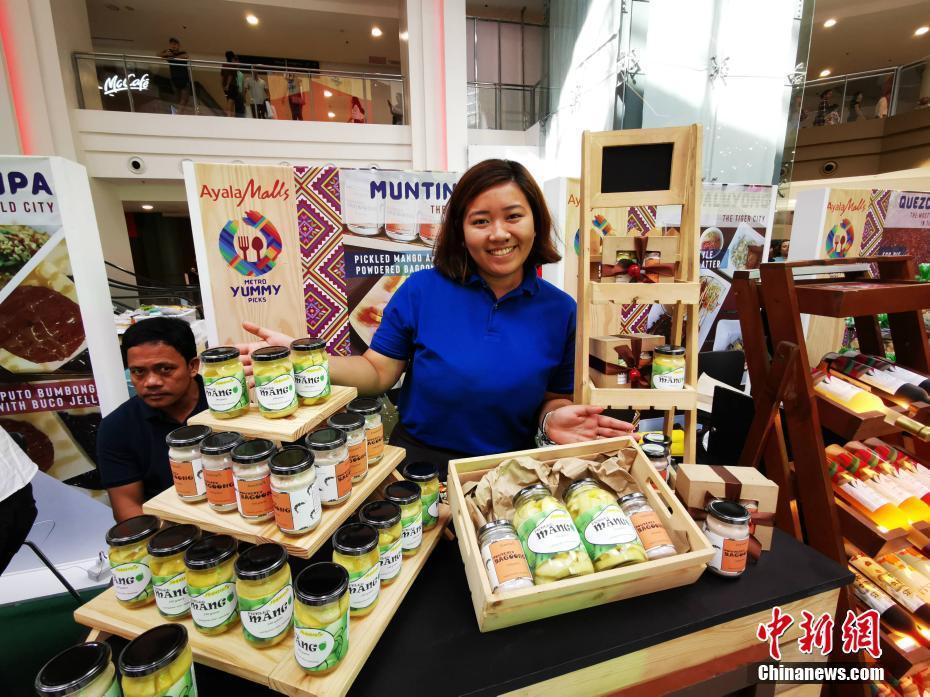12月12日,菲律宾马尼拉一商场举办圣诞新年菲律宾本土美食节。图为商家推介菲律宾本土水果罐头。中新社记者 关向东 摄