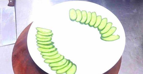 4,将生姜片切成末,将蒜也切成末,然后拿出备好的1根黄瓜,洗净后切成薄片,然后找出一个盘子,将黄瓜片摆在两侧,这样可以让菜色更好看,然后将刚刚切下的鱼尾修整一下,让其可以立在盘子上;