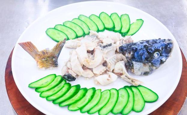 5,准备一个锅烧水并加入适量的盐,然后把备好的鱼骨放入锅中用小火煮2分钟,直至鱼骨变白煮熟后捞出过凉水,沥干水分后摆在盘子中间,而鱼头与鱼尾则摆在两端;