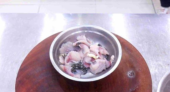 2,将鲤鱼的头和尾切下来放到一边,然后抽出鱼腥线,用刀慢慢将鱼肉切成薄片,并去除掉鱼刺,然后将鱼骨切碎,处理完后清洗一遍鱼肉片与鱼骨;