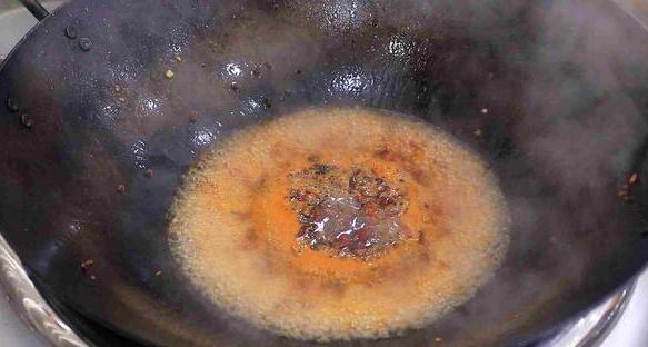 6,将炒锅烧热,加入适量的油,待油的温度达到5成后,加入适量的麻椒、干辣椒和花椒,这里可以根据自己的口味来定,然后待炒出香味后加入姜末与蒜末,然后在加入10g豆瓣酱,翻炒一会儿,直至出现红油后加入少量的清水,然后转小火熬5分钟,使汤汁更浓香;