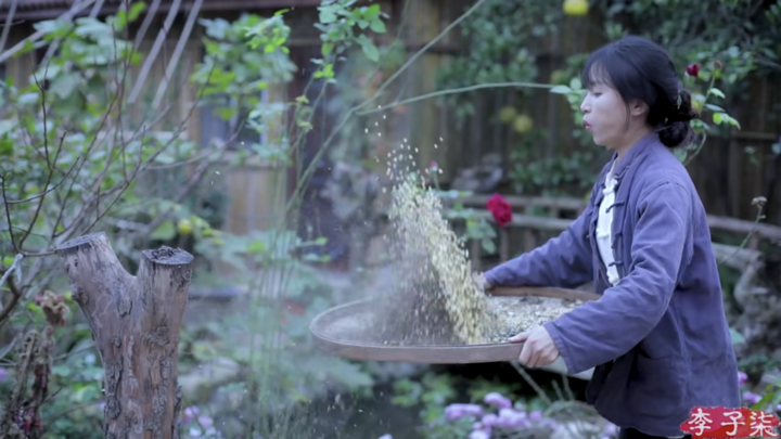 槐花开满枝头,李子柒会做一盘色泽鲜艳的槐花煎蛋;樱桃成熟则要酿一坛樱桃酒;