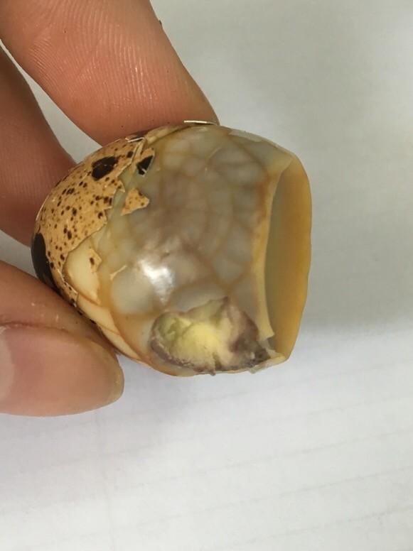 2.煮好放冷水里过下,然后在桌子上滚下,把蛋壳滚碎即可