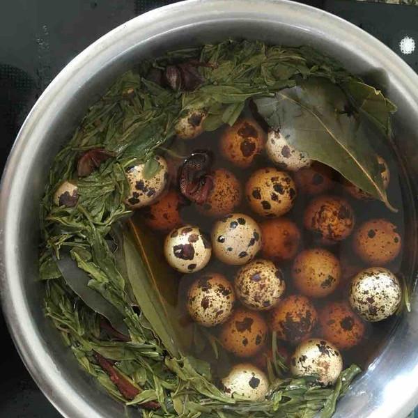 鹌鹑蛋 一斤、八角 2个、香叶 5个、桂皮 适量、精盐 适量、花椒 10个、辣椒 2个、茶叶 一把、酱油 适量