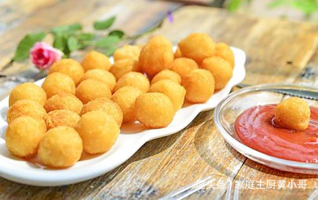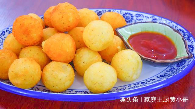 土豆丸子食材:土豆两个,面粉250克,粘米粉50克,食盐一勺,胡椒粉一勺,番茄酱一勺。