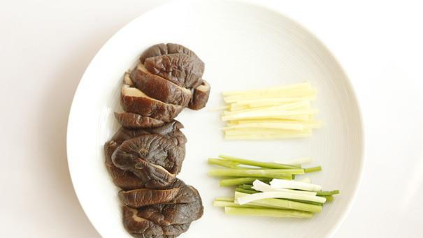 1.香菇泡发洗净切成片、葱切段,姜切丝