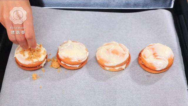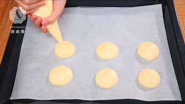 6.将蛋糕糊装入裱花袋,在烤盘的油纸上挤出大小适中的圆形,送入烤箱烤制,上下火180度烤20分钟即可(烤箱提前预热至180度)