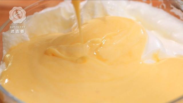 5.将三分之一的蛋白霜舀出与蛋黄糊混合,再将蛋黄糊倒入剩下的蛋白霜中,全部混合均匀