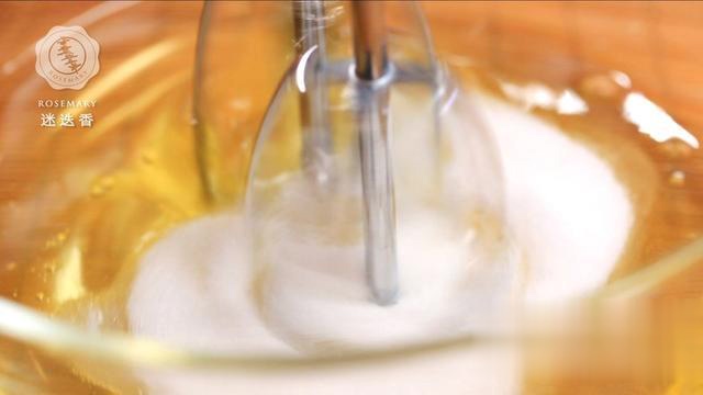 4.将30克细砂糖加入蛋清,打发至干性发泡