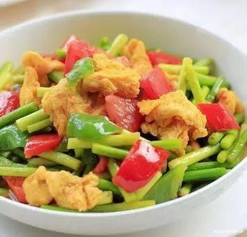 食材:蒜薹、鸡蛋、西红柿 植物油、盐、青红辣椒
