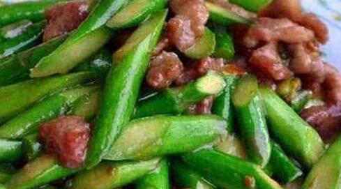 2.把芦笋洗净,芦笋上的老根切了,再把芦笋切成小段。锅里倒油,油烧成七分熟,把肉片炒变色,再加芦笋和一小碗凉水炒匀,加点小辣椒和盐,芦笋炒软了就能盛盘子里了。
