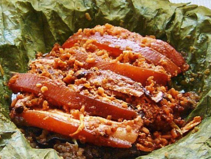 4.荷叶用水浸泡一会,泡软后晾干,把肉铺在荷叶上面。