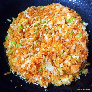 1.胡萝卜擦丝剁细放油炒熟