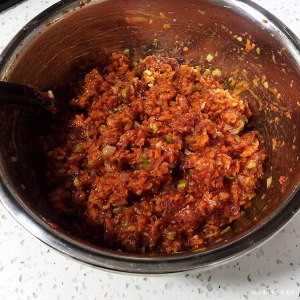 4.胡萝卜凉透混合食材一定要顺着一方向搅上劲,.牛肉要加水少加分次加哦