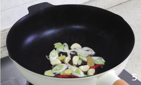 5. 锅烧热,加入油、姜片、葱片、大蒜、干辣椒和香叶,小火爆香2 分钟。