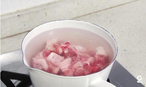 2. 鸭腿洗净剁成小块,放入锅里,加水没过鸭肉,煮沸后再煮 3 分钟,去掉水面的浮沫。
