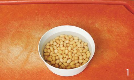 1. 黄豆洗净,加水没过黄豆,室温泡 8 小时,约泡至两倍大。
