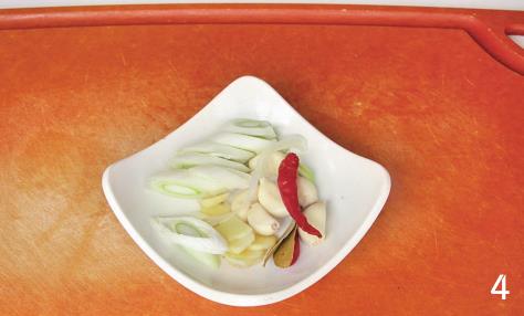 4. 姜和大葱均去皮洗净,分别切成厚约 1 毫米的片。大蒜、干辣椒和香叶均去皮洗净,备用。