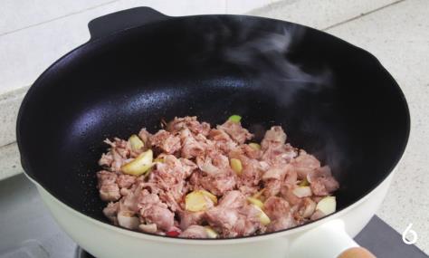 6. 加入鸭腿肉,翻炒至鸭肉紧缩,微微上色。
