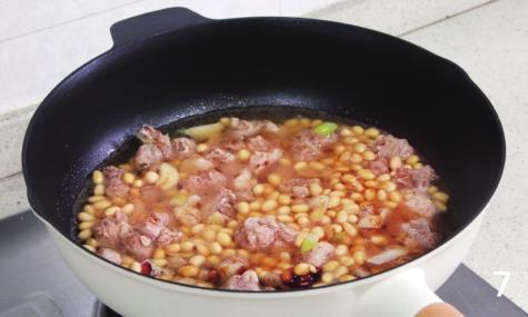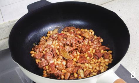 7. 加入黄豆、糖、料酒、生抽、蚝油和啤酒。