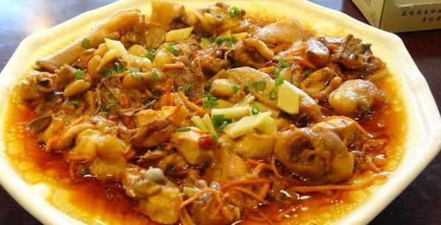 鸡脚500克,香菇50克,红枣枸杞适量,花生米50克,姜片5克。盐调味,料酒去腥!