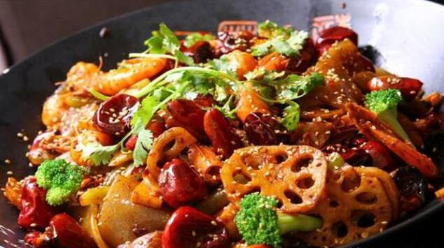 3、锅内入油倒入干辣椒、花椒、蒜瓣爆香。然后加入大虾翻炒,炒至虾上色后加入一包麻辣香锅底料转小火炒出红油。后依次加入莲藕、土豆红薯、菇类、豆腐皮中火翻炒,最后加入茼蒿(绿叶类青菜)翻炒均匀,再根据个人口味加入适量盐调味。撒上白芝麻就可以开吃了。