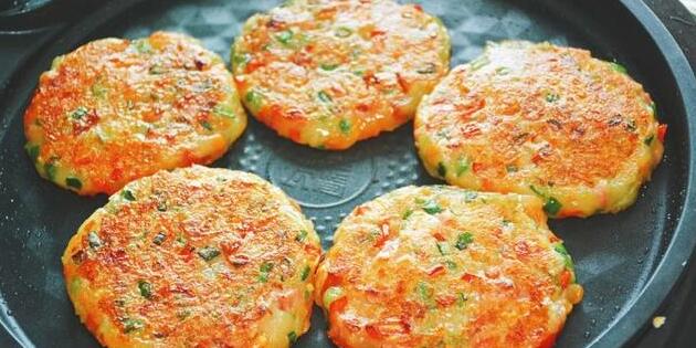第四步:电饼铛中刷上一层食用油,预热两分钟。手上抹上一些油防粘,取适量面糊团成小饼,放入电饼铛中。全部放好之后用铲子轻轻的按压一下,盖上盖子,中火烙3分钟。