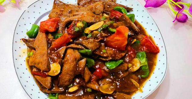 5.炒锅内加入适量的油,油温6成热时放入猪肝,猪肝炒至八成熟时再加入葱花、蒜片和姜丝,然后倒入调好的料汁,翻炒均匀后再放入辣椒块和西红柿块,大火煸炒至辣椒和西红柿断生后关火盛出,即可享用美味了。